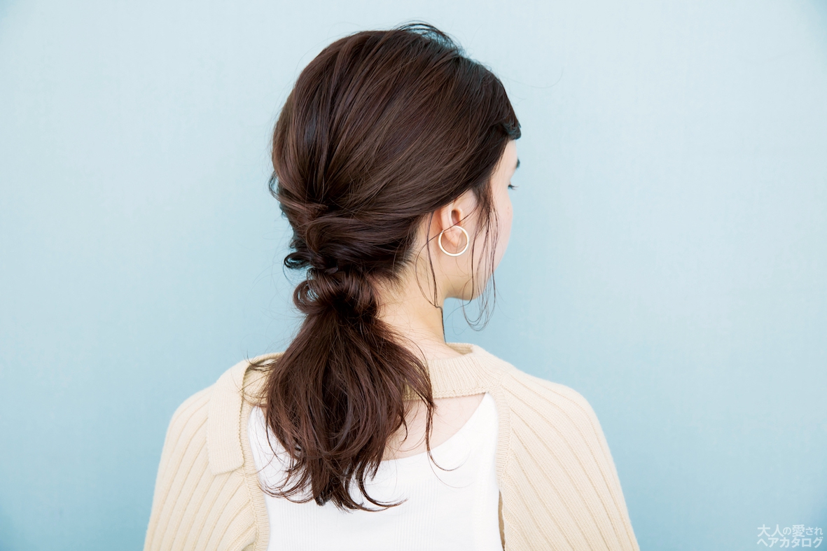 (2)えり足は結んだ髪から毛束を取り出し、くるんと丸めてゴムに通して、装飾的に。